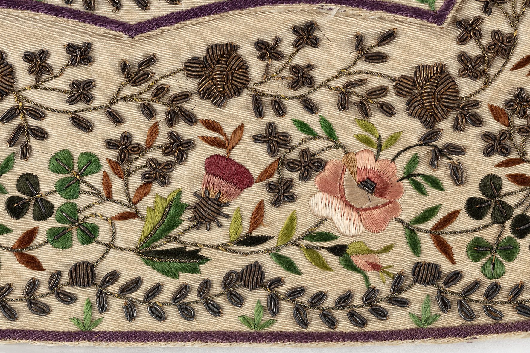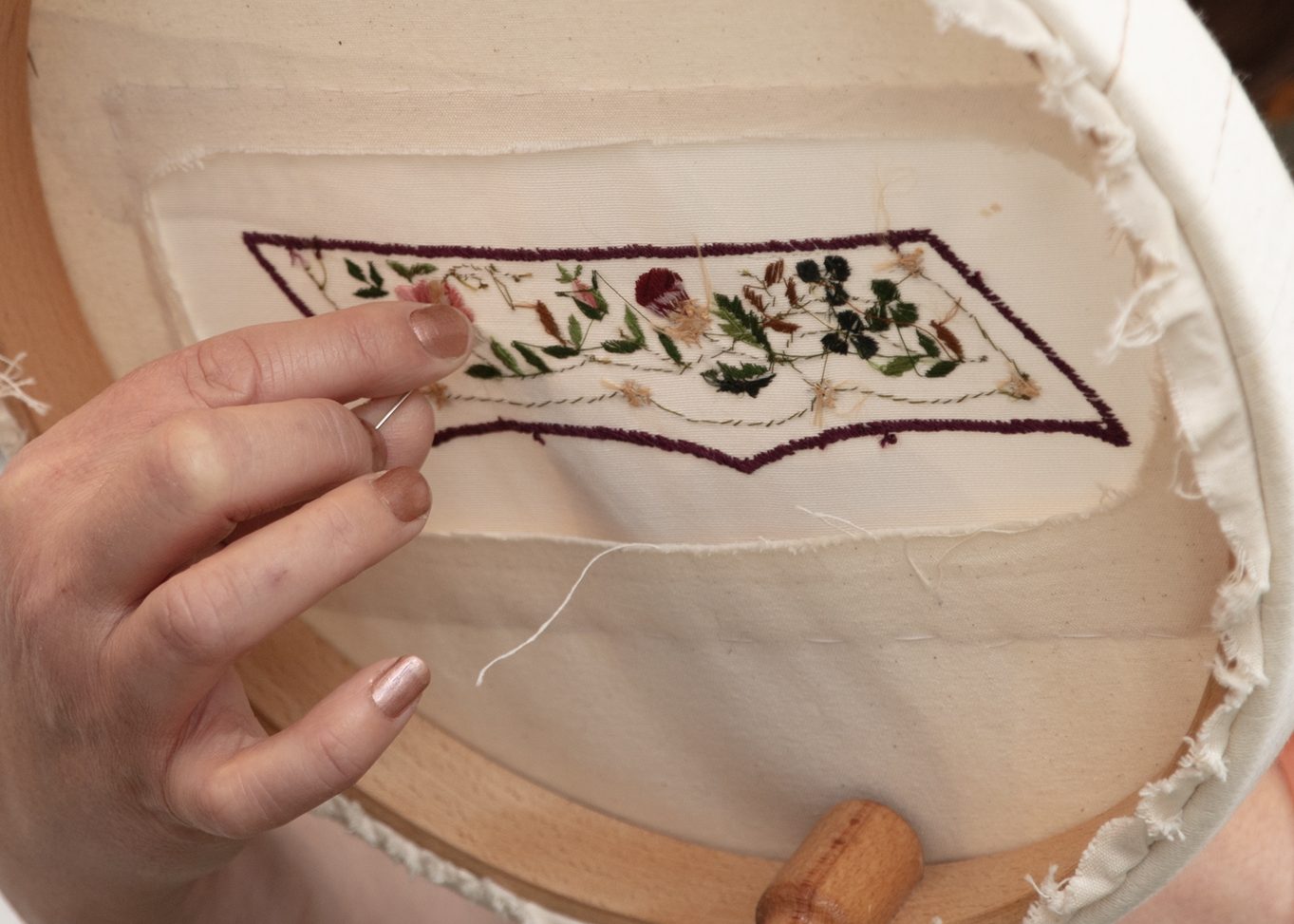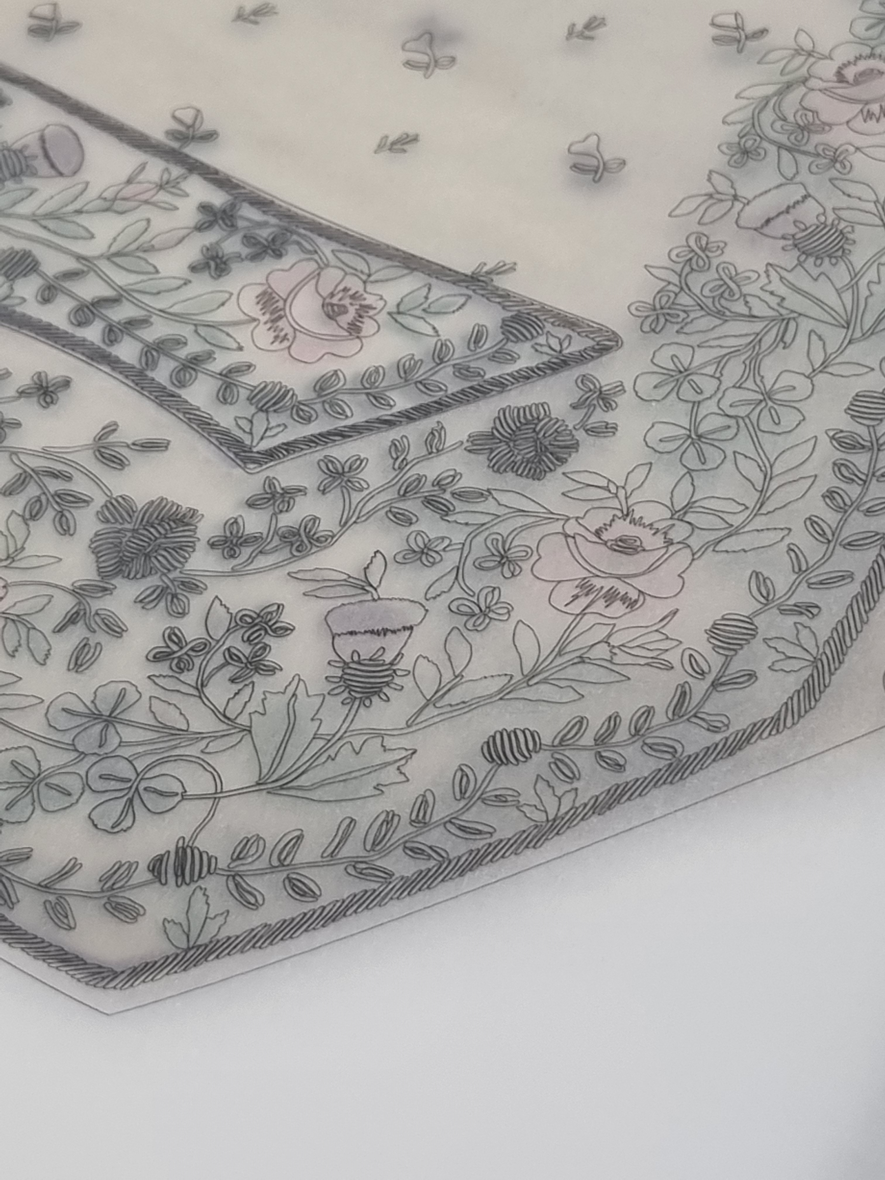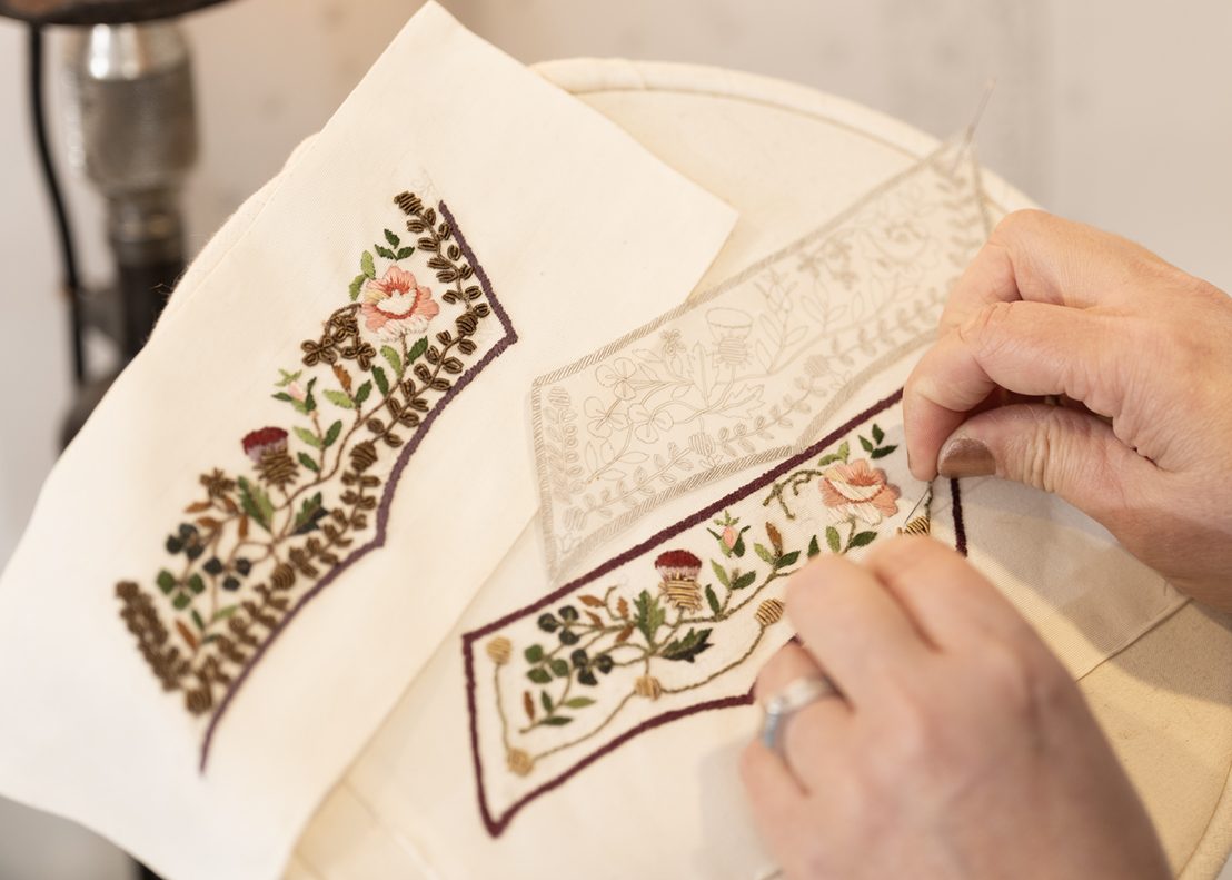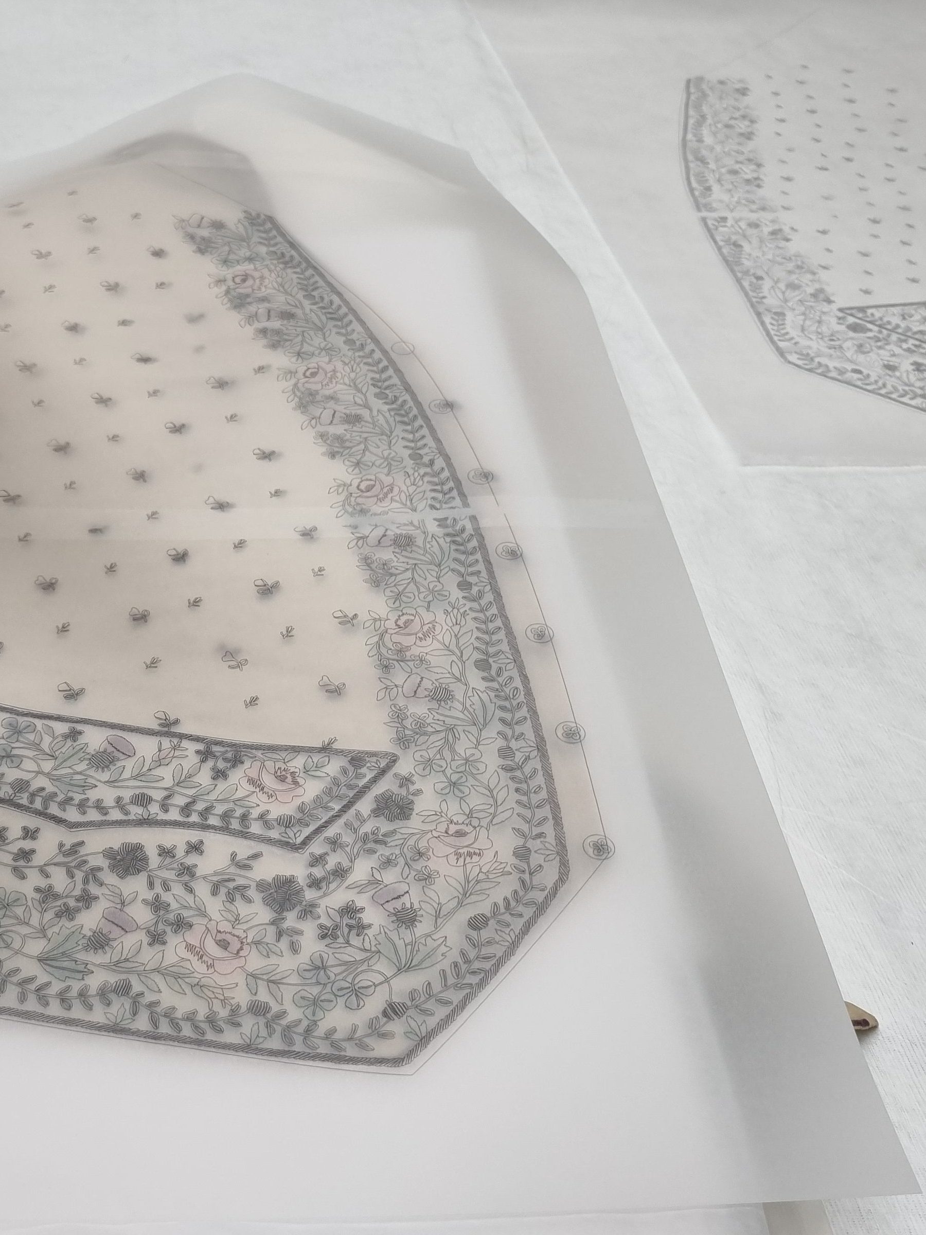 Using this transcribed line version of the embroidery design I now had, I experimented with transferring it onto fabric, comparing the accuracy of the 18th-century method of ‘prick and pounce’ versus the more innovative modern-day application of screen printing and digital printing to create the guidelines for embroidering, a technique often employed in film costumes to achieve accurate repeats. Though the method of rubbing ground charcoal and cuttlefish (nowadays talcum powder) through small, perforated holes in the paper design, outlining the design, which then requires the dots to be connected, is an age-old established method, it is time-consuming and messy, with potential for errors. The delicate fine-line printed versions are the favourable option for a highly accurate reconstruction, though technically, they are not a historical methodology reconstruction. This raises an interesting ethical question regarding processes employed to achieve reconstruction piece.