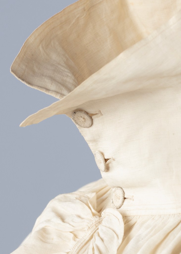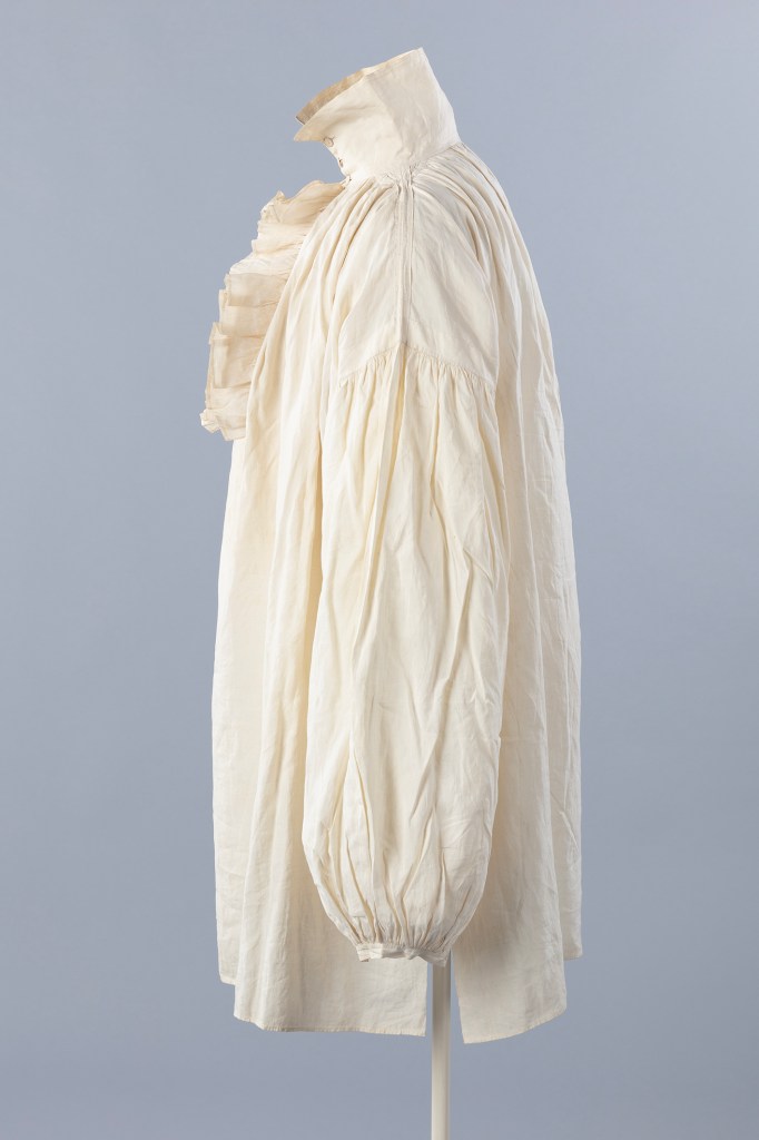 So, physically, what makes this shirt so fascinating? It is an exquisite example of refined garment making within menswear at the turn of the eighteenth/nineteenth centuries. Due to the style and cut of shirts altering very little between the sixteenth and mid-nineteenth centuries, dating can be problematic. Though classed as underwear as it was worn next to the skin. It retains a basic geometrical cut based on a configuration of rectangles, squares and triangles. This makes these shirts the ultimate example of zero-waste pattern cutting. The combination of more minor details assists in establishing a date to this shirt since the basic construction of shirts remained relatively constant. In this case, we have a smaller narrow cuff depth, high standing collar and a very handsome centre front frill in matching fabric, with the body and sleeves still generous in volume. These features all suggest a dating the shirt from the late eighteenth century and early nineteenth century, after the demise of the popular earlier frilled cuffs, but before the early to mid-nineteenth century transitions where cuffs became deeper with rounded corners, and a shirt’s body and sleeves slimmer in fit, and collars evolved from standing to falling or detachable.