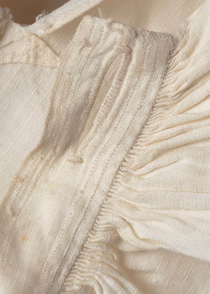 There are small areas of darning in the regions of the selvedges. However, these appear to be fabric weave repairs rather than garment repairs; the linen has a thread count of around 280–300, making the strands remarkably fine, and a loom width of 34 1/4” (880mm). Areas that require structural or aesthetic strength, such as around the armhole, collar, cuffs and side split gussets, have been double-layered. The slashed centre front neck opening is on either side adorned with fabric ruffles made from the same main garment linen, approximately 70mm wide by 700mm long, finely gathered into the 260mm openings. At the base of the centre front neck split, a double-rowed stitched heart shape with a central line reinforced with the addition of an internal patch.