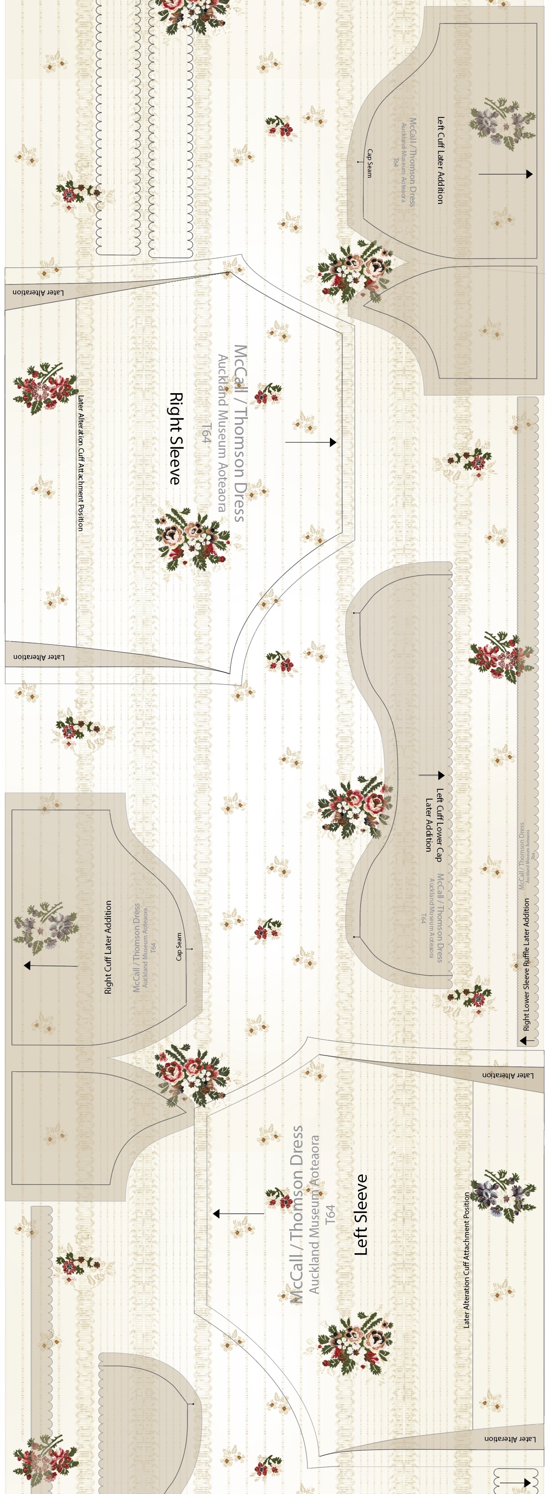 My methodology provides valuable insight into the yield used, what percentage would have been wasted, and significant areas that may have been utilised for additional adornments, such as ruffles or puff edgings, which no longer survive. These insights are not possible with other reverse engineering drafting methods. Note that waste was minimal with such expensive fabrics in the 18th century, it is assumed pieces were placed with the best fit, as not necessarily placed directionally; however, the McCall dress demonstrates concerted decisions of design placement to provide an aesthetic balance on the sleeves, front bodice and back waistline, another example of wealth and grandeur.
